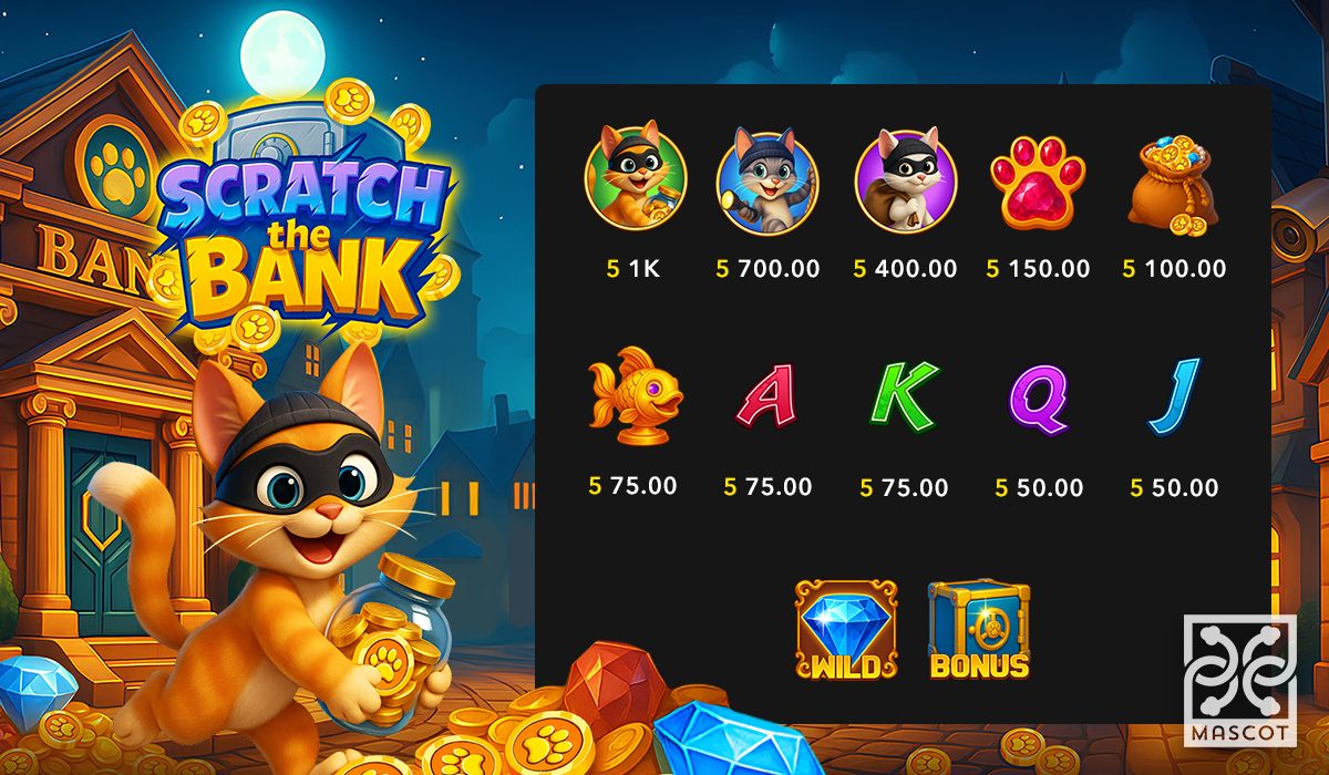 Under the soft light of a luxurious study, three masked cats prepare for the perfect break-in — and you’re part of the crew. Scratch the Bank turns a classic heist scenario into a colorful slot adventure, where every spin holds a mix of suspense and satisfaction. Slot game developers at Mascot Gaming capture the excitement of the chase while keeping the tone playful, making the game both stylish and fun to explore.